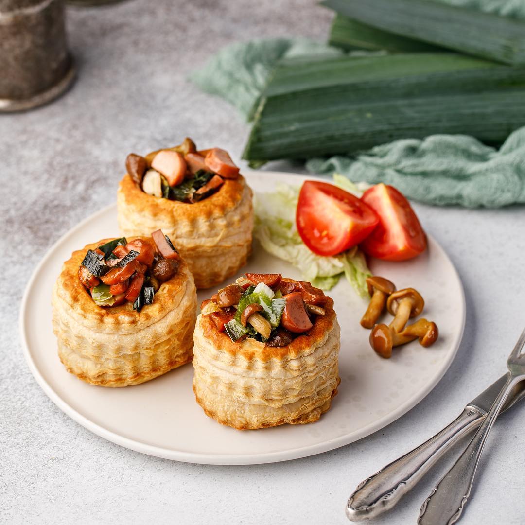 4. Pilze und Würstchen in die Pasteten füllen und kurz im Ofen erwärmen.