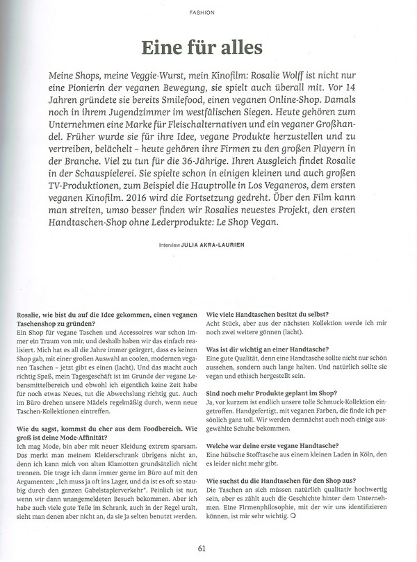 Gegründet wurde das vegane Label von der Schauspielerin Rosalie Wolff, die sich gemeinsam mit ihrem Team seit über 20 Jahren mit veganen und vegetarischen Lebensmitteln und ihrer Entwicklung auseinandersetzt.